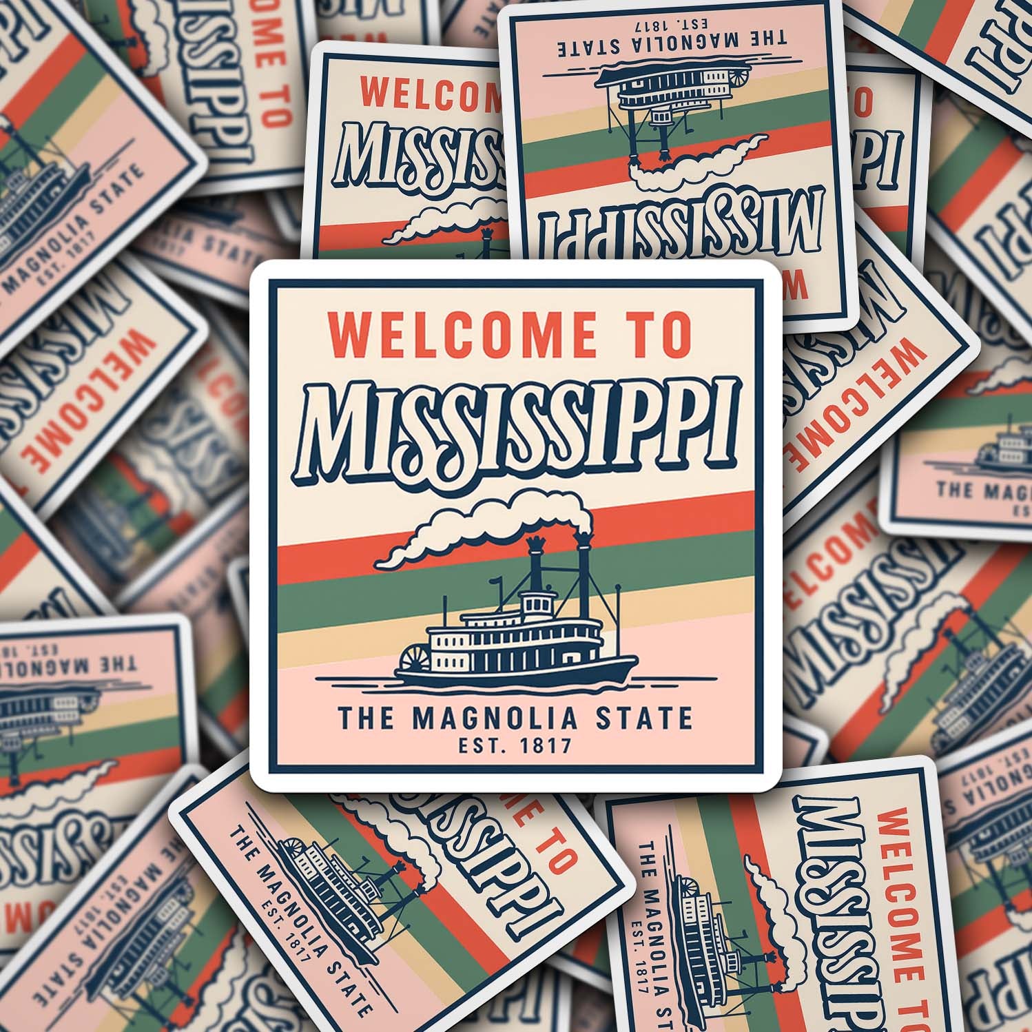 Celebrate The Magnolia State with this vintage-inspired Welcome to Mississippi vinyl sticker! Featuring a classic steamboat cruising the river with colorful retro striping, this design reflects the rich culture and history of Mississippi. Perfect for travelers, collectors, or proud Mississippians, this sticker is a timeless keepsake of southern pride.