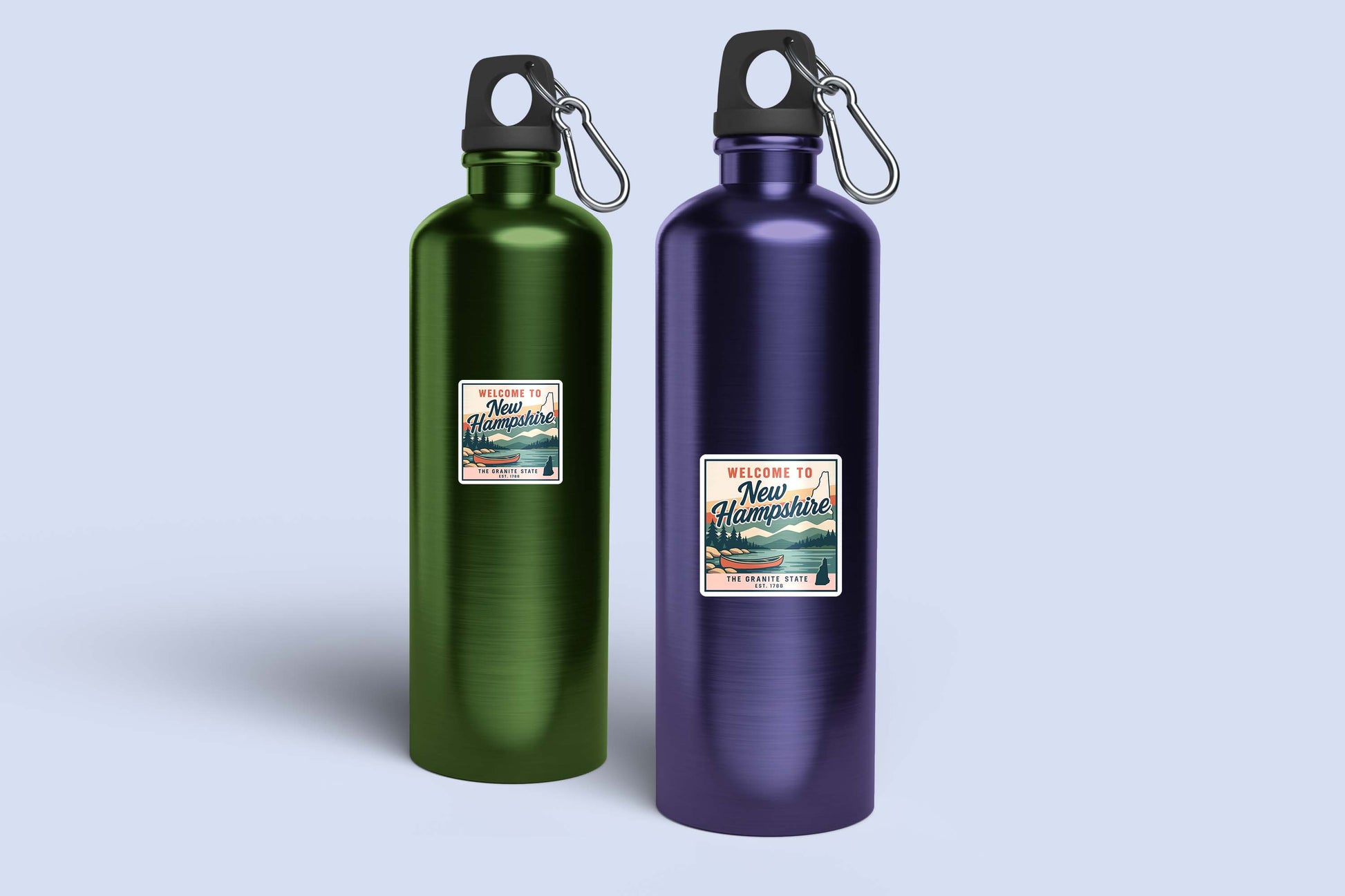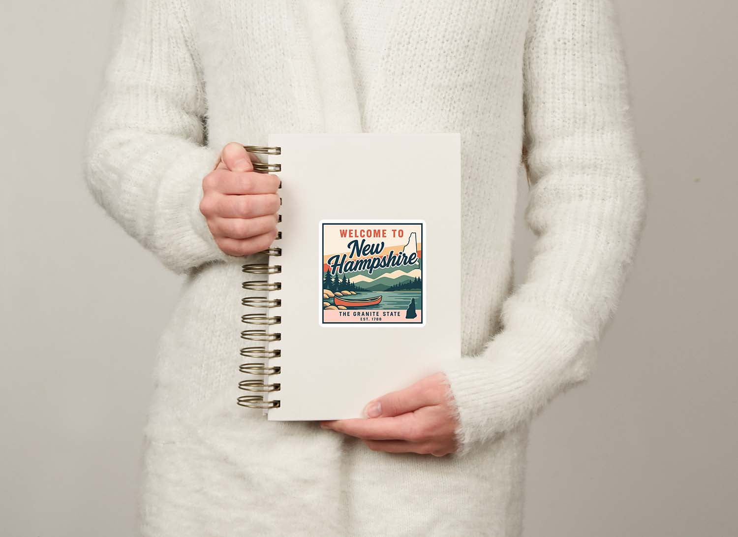 Celebrate The Granite State with this charming Welcome to New Hampshire vinyl sticker! Featuring a scenic mountain landscape, evergreen trees, and a canoe resting on the calm waters, this retro-inspired design perfectly captures the rugged natural beauty and adventurous spirit of New Hampshire. Ideal for travelers, collectors, or anyone who loves the outdoors.