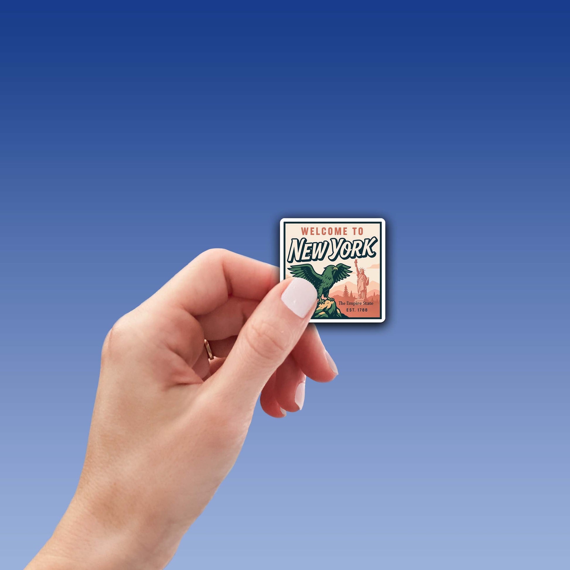 Celebrate The Empire State with this striking Welcome to New York vinyl sticker! Featuring a bold eagle perched against a scenic backdrop of mountains and the Statue of Liberty, this retro-inspired design captures both the natural beauty and iconic landmarks of New York. Perfect for travelers, collectors, or anyone who loves the spirit of adventure and pride in their home state.