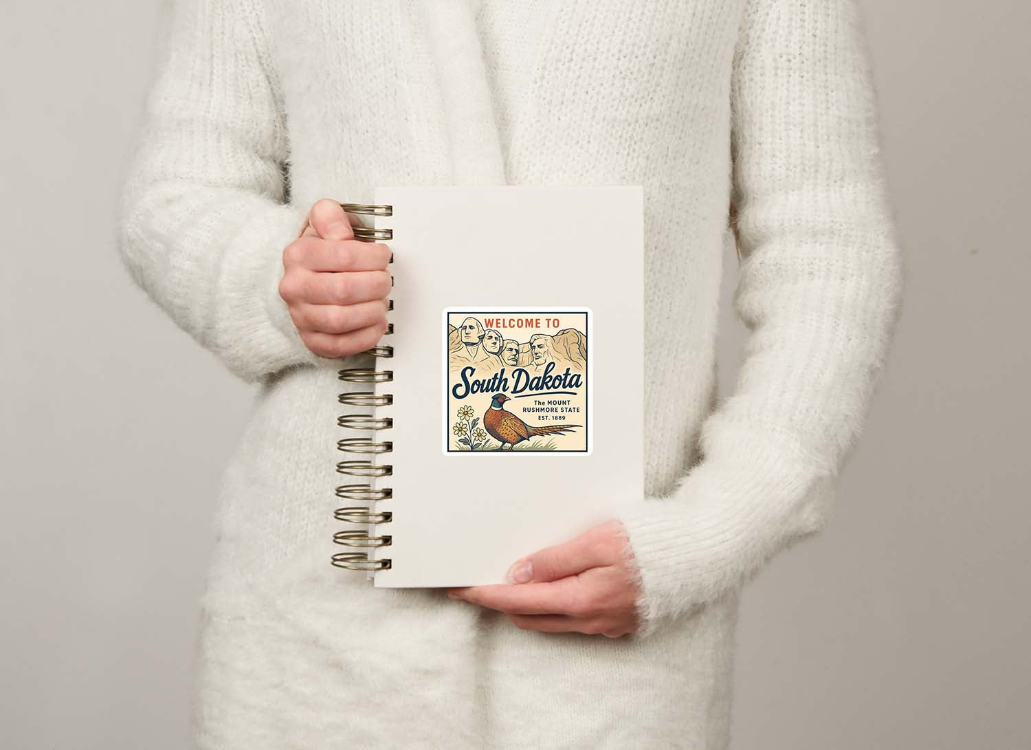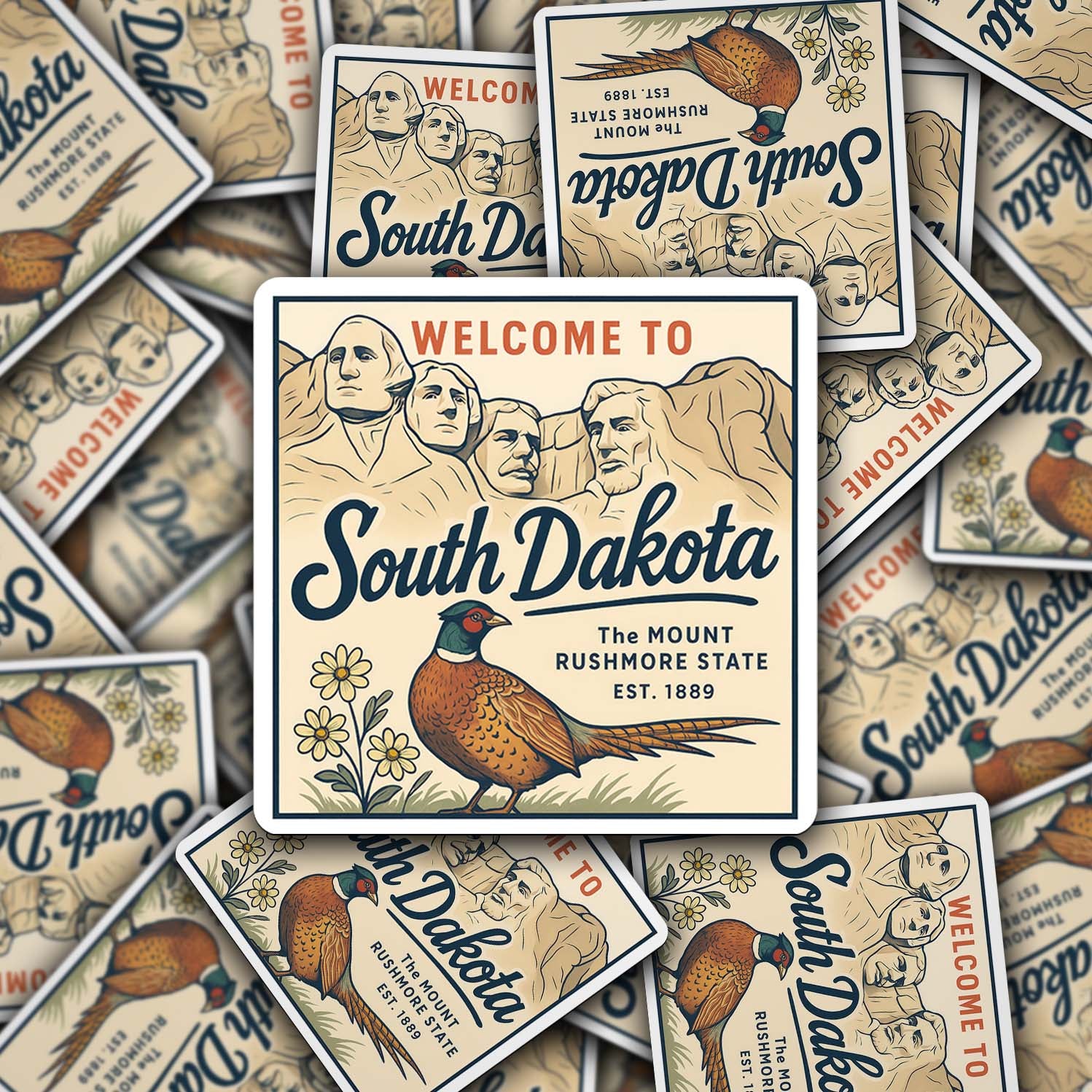 Show your love for The Mount Rushmore State with this Welcome to South Dakota vinyl sticker! Featuring the iconic Mount Rushmore and a beautifully illustrated pheasant, this retro-inspired design captures the rugged pride and natural beauty of South Dakota. Perfect for travelers, collectors, or anyone who calls this great state home.